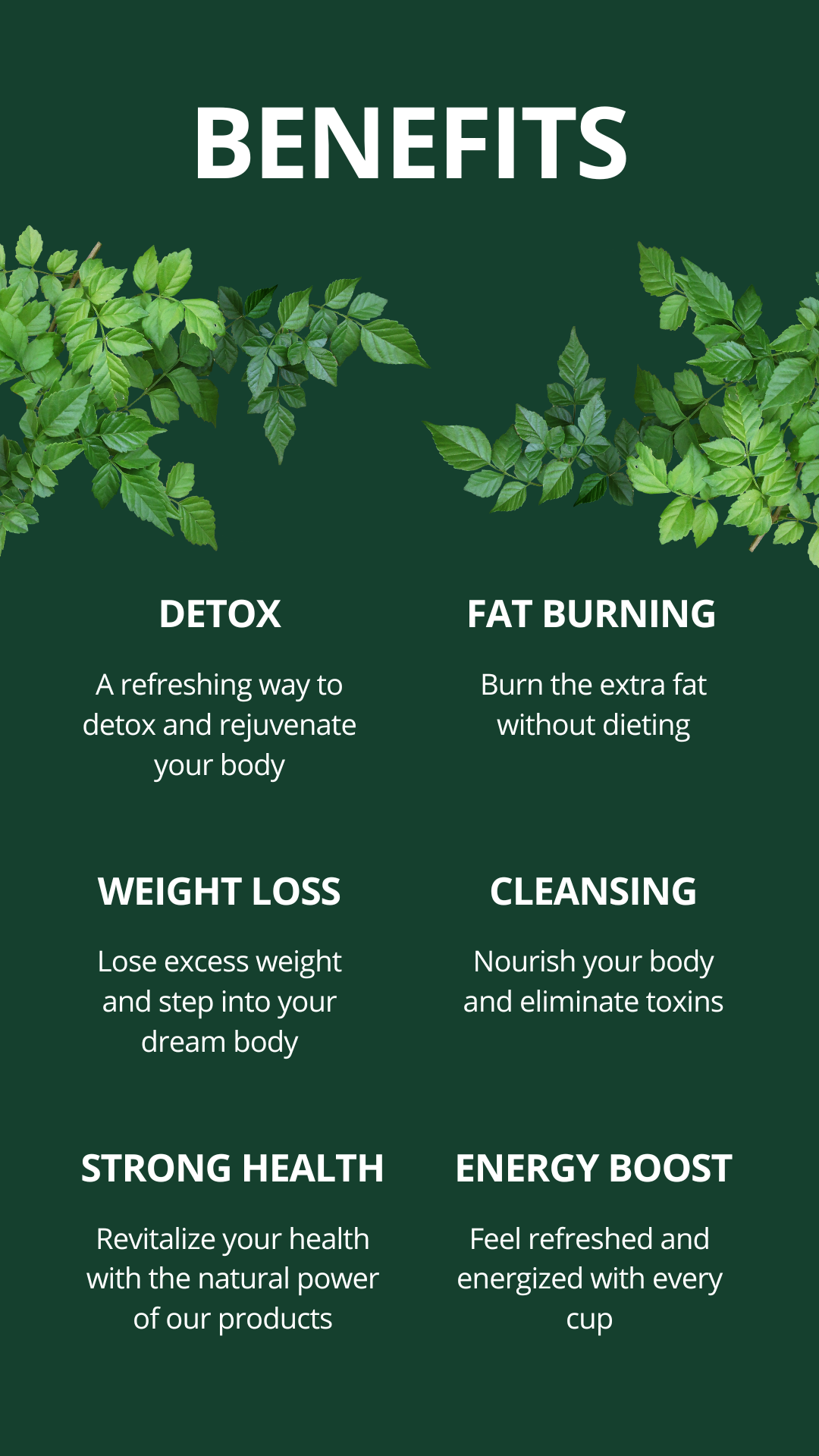 Hibiscus, Rosemary, Heather, Senna, Juniper berry, Kitre, Flaxseeds, Ginseng, Saffron, Cherry Stalk, Mate, Lemon.
